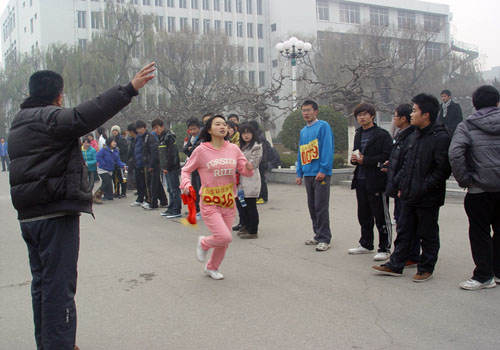 冬季的下午寒风凛冽,丝丝的薄雾透着寒气。参赛的九支队伍,早早的来到校园门口集合,个个精神抖擞,整装待发;工作人员各就各位;亲友团准备就绪,为选手们加油打气。枪声一响,第一棒的男选手们似离弦之箭冲了出去,动若脱兔,现场顿时沸腾起来。随后的女选手们毫不示弱,轻盈矫健的身姿挥洒出飒飒风范……就这样男女交叉接力,时间一分一秒的过去,而现场的气氛依旧火热,加油声、呐喊声此起彼伏。最终,经激烈角逐,经管系第二代表队等六支代表队夺得前六名,并获得羽毛球拍一副。