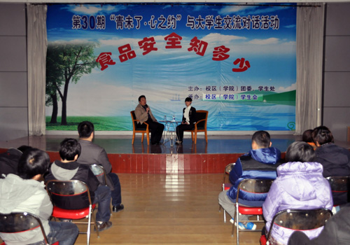 12月8日,由校区(学院)团委、学生处主办,校区(学院)学生会承办的第三十期“青未了·心之约”与大学生交流对话活动在大学生素质拓展中心举行。本次对话交流以“食品安全知多少”为主题,邀请到泰安市食品药品监督管理局食品化妆品监督所副所长丛庆作为嘉宾与大学生进行了对话交流。