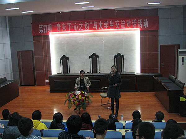 尤洪杰毕业于北京科技大学,先后获得山东师范大学工学学士、法学学士,兰州铁道学院工学硕士学位,同时还顺利获得国家律师资格证书和注册会计师资格证书。1999年到山东临沂市中级人民法院工作,现任民一庭正科级审判员,一级法官。曾先后在最高人民法院《中国司法改革的十个热点问题》、《理论纵横》、《中国学术研究》、《政法论丛》、《常州法学》、《山东审判》等国家、省级刊物上发表论文50余篇。尤洪杰以其幽默亲切的方式开始了对话活动。他详细介绍了自己的学习工作经历,并对自己那一代人对于整个社会的观点和看法作出了详细阐述,引经据典,充分展现了其渊博的知识与深厚的文化底蕴。他指出当代大学生应该特别注重人文教育,努力提高综合素质。素质的一个很重要的方面是相互尊重,“己所不欲,勿施于人;己所欲,慎施于人”。良好的沟通协调能力和人际交往能力更是提高素质的必备前提。好的沟通能力交际能力是情商高的重要表现,更是同学们走向成功必备素质。好的沟通交际能力不仅可以改变你的性格,甚至可以改变你的命运。当然高的情商还需要高的智商来支持,因此他要求同学们一定要多读书,多积累,努力扩大知识面,才能运筹帷幄,走向成功。他以自己工科出身而后转为法学来说明文理相通的重要性。接着,他结合当前法院系统对毕业生的要求给同学们提出了具体希望和建议。