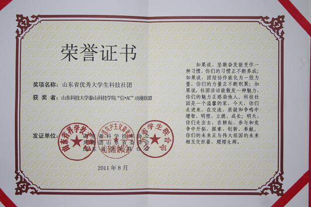 近日,2011年山东省优秀大学生科技社团及山东省优秀大学生科技社团干部评选活动结果揭晓,校区(学院)“信A·C”动漫联盟协会被评为“山东省优秀大学生科技社团”,“信A·C”动漫联盟协会负责人张军同学被评为“山东省优秀大学生科技社团干部”。