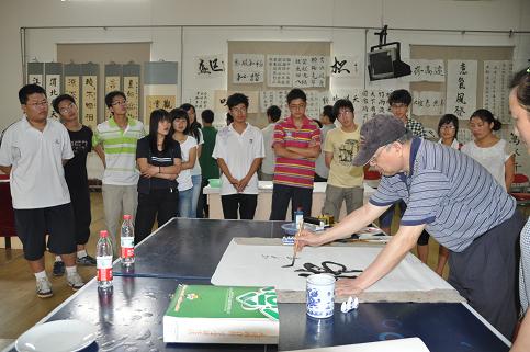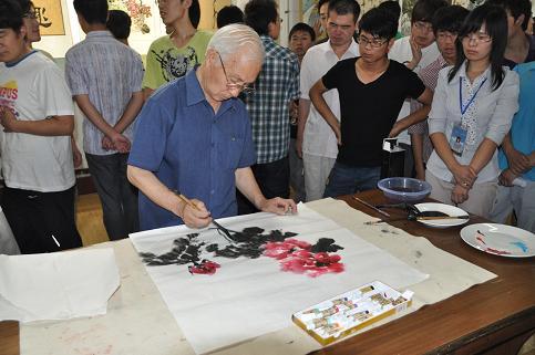 书画家与学生作者一起现场作画,传授技巧,他们毫不吝惜地为师生们现场挥毫,一幅幅作品赢得了在场同学的热烈掌声。