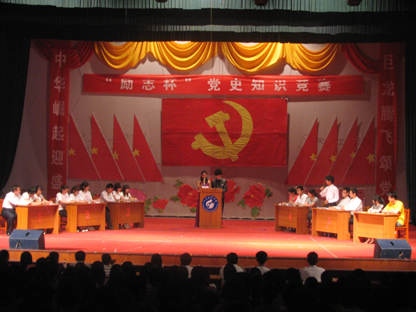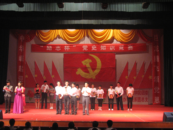 党史竞赛接力红歌汇演,带领同学们继续回顾党的革命历程,再现党的光辉岁月。活动现场,“国是我的国,家是我的家……”歌舞《国家》以迅速点燃激情之势拉开序幕。东西校区五个系的代表队参加了此次竞赛,分别亮相,唱出自己的口号。继而,活动进入紧张问答阶段——党史必答、抢答、竞答、时政简答。从红色经典人物到重大历史事件,从中华人民共和国成立前到当今时政热点,内容丰富的问题从多个方面充分反映了党的革命史和建国史。参赛队伍默契配合,从容答题,赢得了观众一浪又一浪的掌声。其中机电系的“桃园结义”代表队在抢答竞答中凭借敏捷的反应、百分百正确率的绝对优势摘得桂冠,优异的表现折服观众。文法系和资土系代表队获得二等奖,经管系和信息系获得三等奖。徐铭等5名同学获得了最佳选手荣誉称号,冯振亮等10名同学获得了优秀选手奖项。