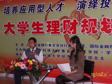 4月14日,建设银行泰安市分行客户经理、国际金融理财师檀武做客由校区(学院)学生处、团委主办,经管系团总支、金融教研室承办的第十三期“青未了·心之约”对话交流活动,为经管学子讲解在校期间如何设计理财规划等知识。