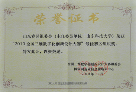 近日,在2010年“全国三维数字化创新设计大赛”总决赛上,泰安校区荣获最佳赛区组织奖。全国大赛组委会主任、国家制造业信息化中心主任、国家自然科学基金委员会副主任孙家广院士为校区颁奖,山东省三维数字化技术教学研究会理事长、山东赛区组委会主任、机电工程系主任张建中参加了颁奖仪式。