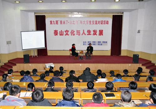 12月6日,由校区(学院)团委、学生处主办,校区(学院)学生会承办的第九期“青未了•心之约”与大学生交流对话活动在东校园报告厅举行。此次活动的主题是“泰山文化与人生发展”,邀请到泰山学院汉语言文学院院长、教授张用蓬与大学生进行对话交流。