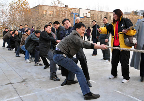 初冬的寒冷阻挡不了教职工参赛的热情,比赛哨声一响,老师们立刻绷紧神经,两臂用力,双腿踩实,随着口令一齐使劲,“一,二!”“加油!加油”场上队员拼搏努力,场边啦啦队叫好助威,整个比赛场地顿时淹没在助威声、叫好声和欢呼声中。第一轮比赛结束后,胜队欢呼雀跃,信心倍增,败队则总结经验,重整旗鼓,从头再来。整个比赛场仿佛是一个欢乐的海洋,处处洋溢着全民健身、大众参与的喜悦和团结友爱、拼搏向上的精神。