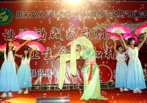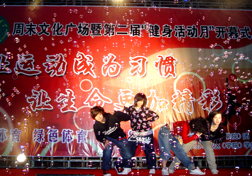 人头攒动、礼花飞扬的广场上,同学们精神抖擞,期待并见证着健身活动月的开幕。开幕式上,裁判员代表和运动员代表进行了比赛宣誓,校区(学院)团委甄惠老师发表致辞,他号召全院师生积极参与体育运动,全面提高身体素质;要求裁判员维护公正的体育裁决,营造良好的竞技氛围。随着甄惠老师宣布健身活动月正式开幕,以“阳光体育,绽放激情”为主题的第二届“健身活动月”启动仪式暨周末文化广场立时启动,迅速点燃了同学们的运动热情。动感十足的啦啦操、潇洒有型的PS街舞、绚丽精彩的轮滑、优美动人的舞姿……现场气氛不断的推向高潮,运动的激情传递到每位同学的心中。