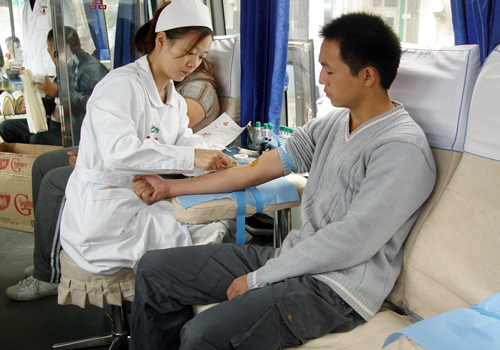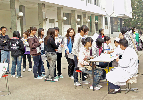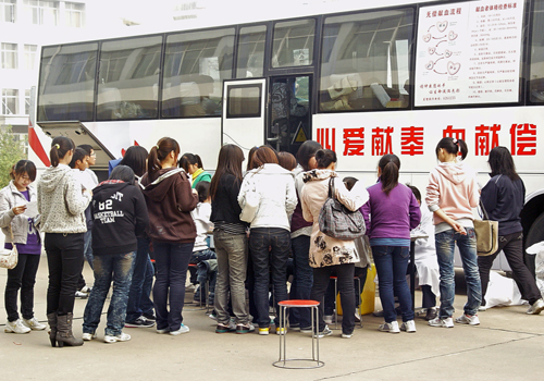 此次活动以“无偿献血,爱在心中”为主题,历时两天。在整个活动中,同学们献血的积极性一直很高。在红十字协会工作人员的精心组织与细致安排下,活动现场秩序井然。准备献血的同学在等候区填写无偿献血申请表,并耐心的等待着下一步的体检;正在献血的同学则满脸兴奋,没有流露一丝紧张情绪,与陪同的学生谈笑风生;而献完血的同学则在医生、同学的慰问下走出献血车,脸上热情洋溢着光荣与自豪。大多数同学都是第一次参加无偿献血活动,在血站工作人员无微不至的照顾和献血服务志愿者们热情周到的服务下,他们的献血过程顺利而温馨。然而验血过程中,也有一部分同学因为各种原因不能献血,一位大一新生拿着自己不合格的验血单说:“我不懂献血的知识,这次没有合格,回去后我会仔细阅读这本“献血知识手册”,尽快养好身体,争取下次献血成功。”