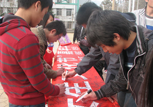 开幕仪式由校区(学院)团委主办、校区(学院)学生会承办,主要以签名活动为主。当十几米长的红色横幅在礼堂前展开时,“第二届女生文化节嘉年华”的字样赫然映入眼帘。横幅两旁的宣传展板,色彩明朗,内容简约,对同学们起到了很好的导引作用。怀揣着对青春的梦,夹杂着对生活的爱,同学们纷纷加入了签名活动中。夕阳的余晖洒在鲜红的条幅上,签字笔在同学们的手中传递着,现场充盈着温馨而醉人的祝福暖流。年轻人的节日魅力无穷,吸引了众多同学驻足参与。短短的20分钟内,条幅上汇集了密密麻麻的名字,承载了众多同学对女生的祝福、对活动的支持。签名过程中,部分同学相继向工作人员了解活动的具体细节,展现出了对女生文化节举办的迫切期待。