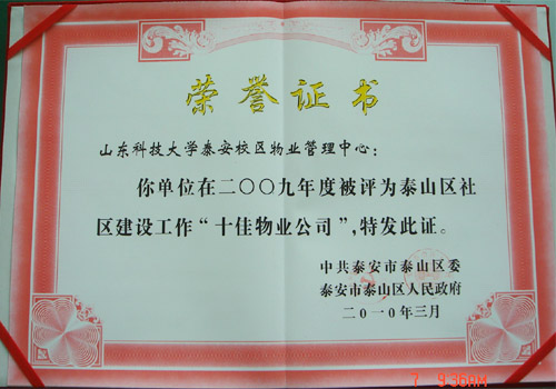 日,泰安市泰山区召开的“社区服务提升年”表彰大会上,泰安校区物业管理中心被授予泰山区“十佳物业公司”荣誉称号。