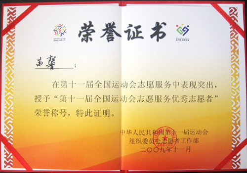 苗馨同学全运志愿服务的优秀表现和热情认真的工作态度在展现出良好的志愿者风范的同时,也用自己的实际行动挥洒了校区(学院)大学生较高的综合素质和良好形象,并为学校赢得了荣誉。鉴于苗馨同学的优异表现,校区(学院)授予她“优秀共青团员”的荣誉称号。(作者:甄惠 邵悦)