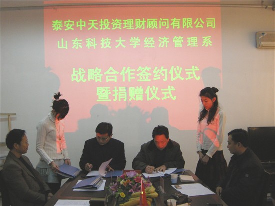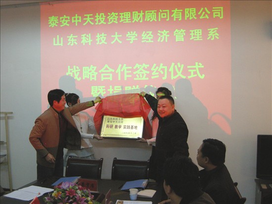 12月18日,经济管理系与泰安中天投资理财顾问有限公司教学实践基地揭牌仪式暨捐赠仪式隆重举行。泰安中天投资理财顾问有限公司总经理周勤海、常务副总经理刘文豪、齐鲁证券升平街营业部总经理闫立新、资深证券专家焦圣岐;经济管理系党总支书记韦安永、主任周洋、副书记兼副主任陈福刚、副主任张振华、李军三,教科办、金融教研室负责人及部分学生代表等出席揭牌仪式。仪式由经济管理系副主任李军三主持。