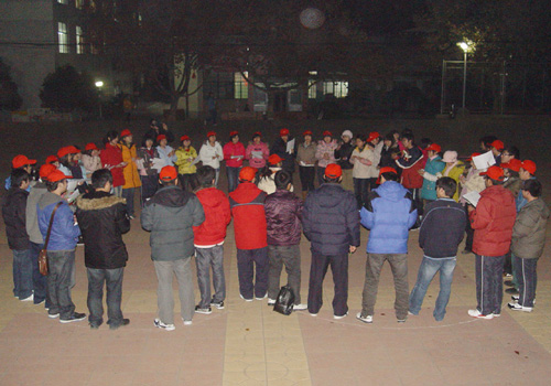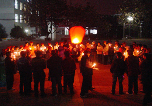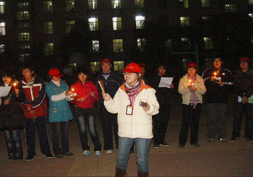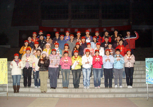 当日,青年志愿者协会联合校区(学院)广播站,为残疾人倾情献歌《和你一样》,并征集同学们的深情祝福语,以广播的形式,将祝福和爱心传递至每一个需要关心的残疾人朋友。当晚,志愿者们头戴红帽、手持蜡烛和荧光棒,在礼堂前摆出充满爱的“心”形,用他们虔诚的心演唱着一首首动人心弦的歌曲。“和你一样,一样的坚强……”动听的歌声、感人的话语打动了所有在场的同学,他们都不由自主的加入到队伍中来,纷纷在寄托祝福的红心卡片上写下自己的名字和祝福。同学们还与协会工作人员一起放飞满载祝福的孔明灯,希望把自己的祝福带给所有不幸的人们。最后,同学们合影留念以铭记这一难忘的时刻。