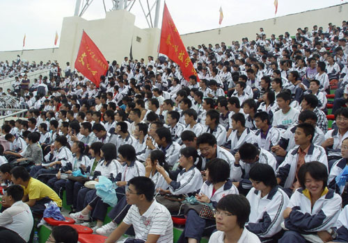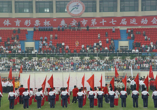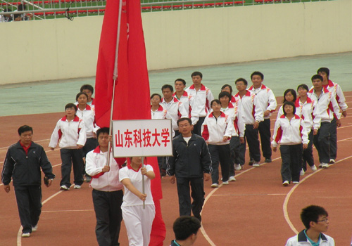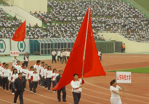 在共和国六十华诞及第十一届全运会开幕之际,泰安市举办了第十七届市运动会,校区(学院)积极组织运动员参加运动会,并组织学生出席开幕仪式。校区(学院)千余名09级新生以系为单位,统一着装校服,沿路行进秩序井然有序,充分体现了科大学子的良好风采。体育馆内白鸽飞翔,彩旗飘扬,入场仪式中,每一代表队入场,同学们均以掌声相应,当山东科技大学代表队进入场地时,场内更是群情激昂,报以热烈的掌声和欢呼声。随后,在雄壮的国歌声中,五星红旗缓缓升起,全体肃静,行注目礼。随后的开幕式节目表演更是精彩纷呈,引得观众欢声雷动。最后,伴随着会歌《美好未来》的优美旋律,开幕式圆满落幕,各系学生排着整齐的队伍返回学校。
