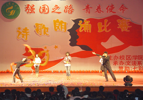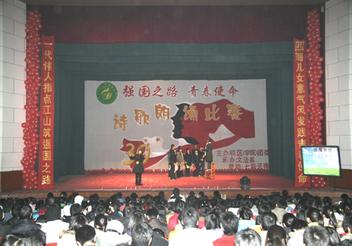 为丰富校园文化生活,激发学生的爱国热情,11月28日,由校区(学院)团委主办,文法系团总支承办的“强国之路,青春使命” 诗歌朗诵比赛在西校园礼堂成功举办。