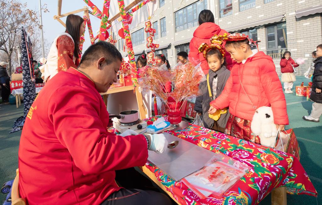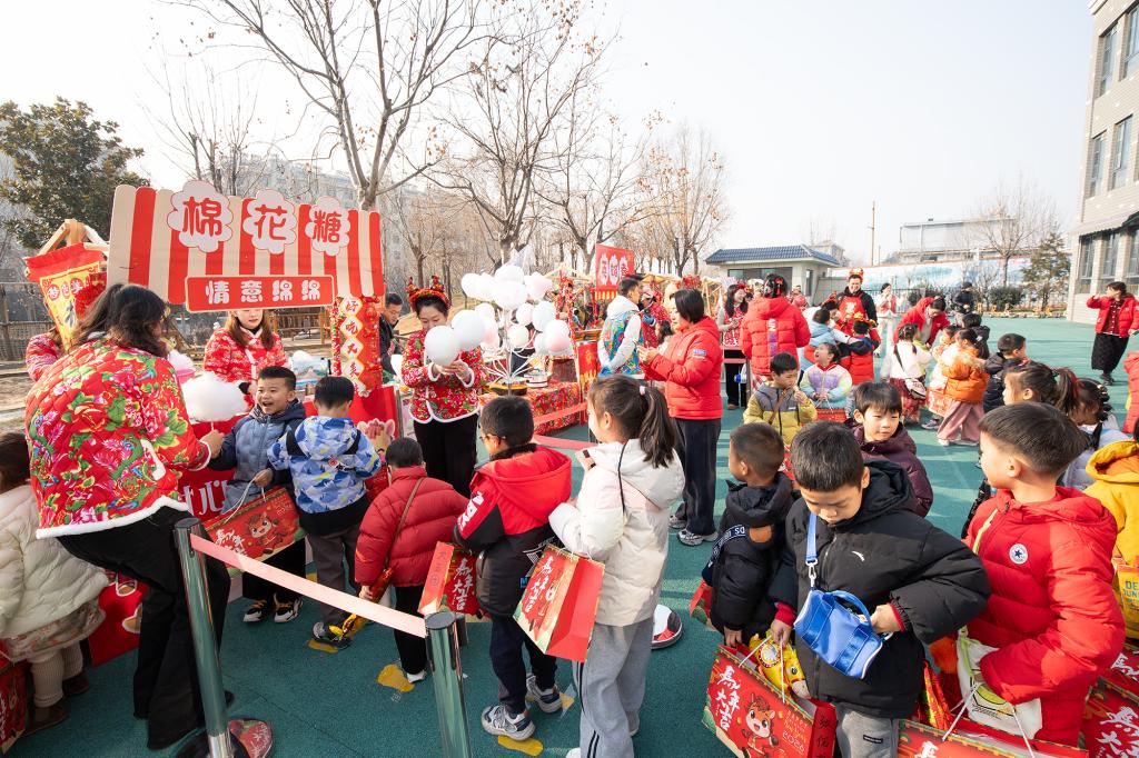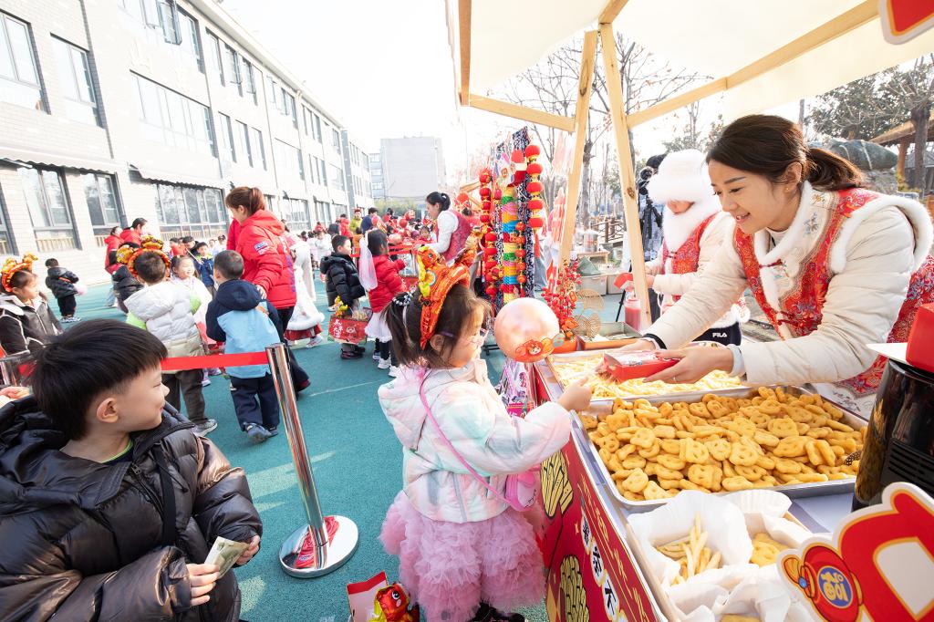 活动期间,幼儿园内张灯结彩、笑语阵阵。老师们将最具烟火气的“赶年集”场景搬进户外场地,将富有年味的习俗,巧妙融入课程与一日生活之中。民俗摊位依次排开,传统小吃香气四溢,非遗展示精彩纷呈,孩子们穿梭其间,在热闹真实的情境中,亲身感受中华优秀传统文化的魅力。