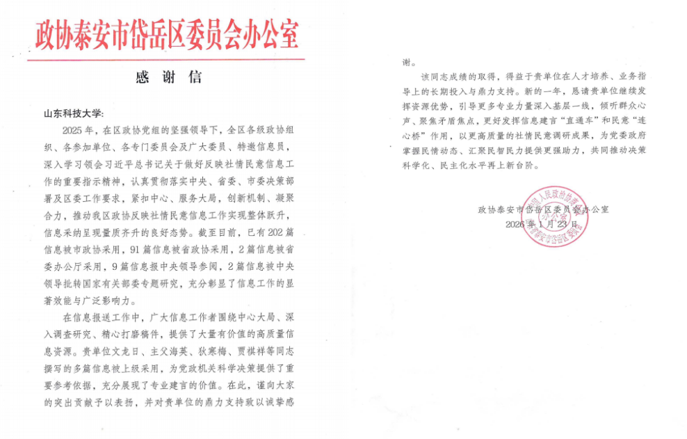 感谢信中指出,2025年,泰安校区文龙日、主父海英、狄寒梅、贾祺祥4位民主党派教师撰写的10篇信息被省政协采用,1篇信息被省委办公厅采用,为党政机关科学决策提供了重要参考依据,充分展现了专业建言的价值。