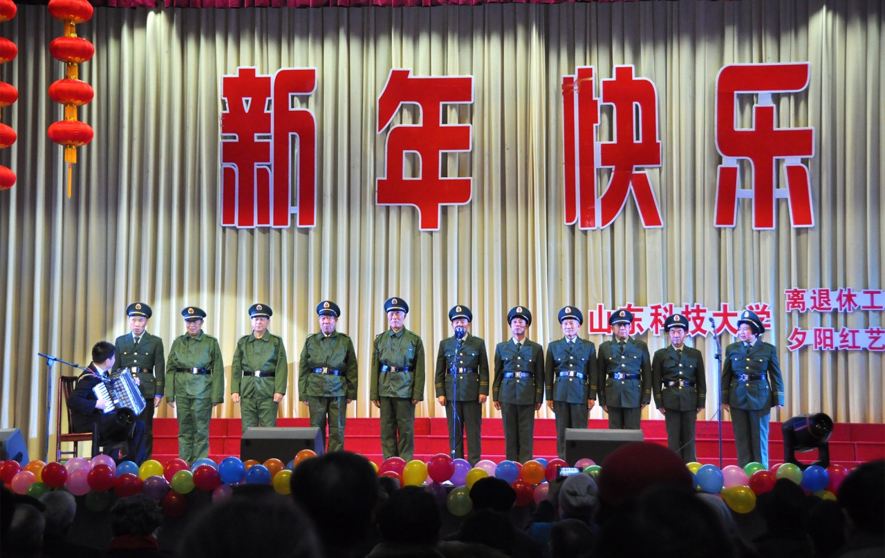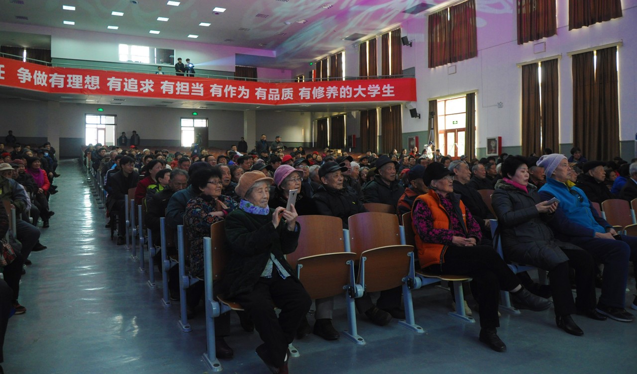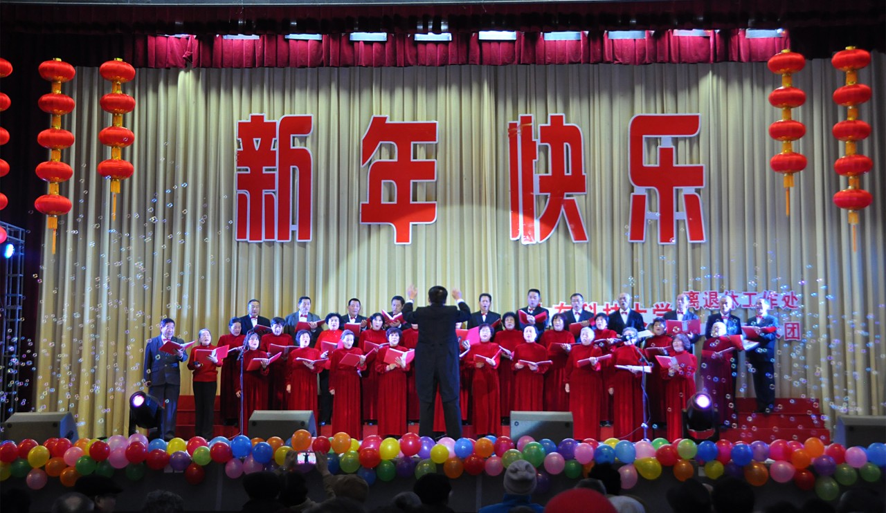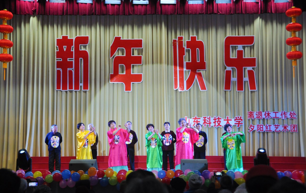 金鸡辞旧岁,瑞犬报春来。在新的一年即将到来之际,由我校离退休工作处和夕阳红艺术团共同主办的以“贯彻党的十九大精神,不忘初心跟党走,开启2018新征程”为主题的离退休教职工庆元旦迎新春联欢会于12月29日下午在我校岱宗大街校园礼堂隆重举行。校党委常委、副校长兼泰安校区党委书记、管委会主任王少鹏,泰安校区党委常务副书记刘传玺,泰安校区管委会副主任贾长响,中国音乐家协会会员、泰安市音乐家协会主席米建平,山之韵合唱团团长、泰安市百姓文化艺术协会艺术顾问、山东科技大学夕阳红艺术团艺术顾问邓旭教授以及校区相关部门的领导和400余名老同志们欢聚一堂,共度佳节。