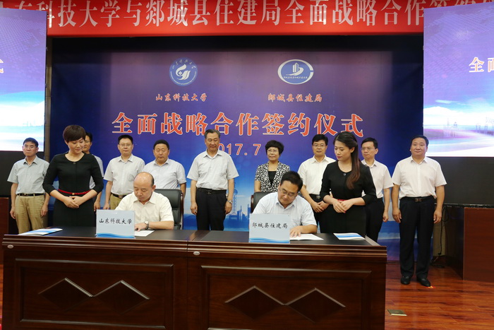 资源与土木工程系主任贾宏俊与郯城县住建局党委书记、局长赵鹤亭分别代表校地双方在合作协议上签字。