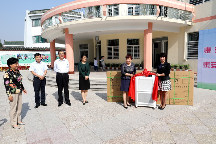 参观后,泰安市宏兴物资有限公司为幼儿园师生捐赠了空气净化器,并给孩子们送来了节日的祝福。(文:张海红 图:任卫兵)