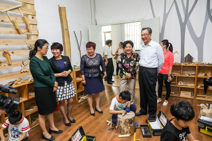 在王少鹏等的陪同下,成丽一行参观了幼儿园木工区、建筑区、农家生活体验区、建构区等专题活动区,校区后勤管理处副处长、科大幼儿园园长梁荣芹向成丽一行汇报了幼儿园办学的情况。成丽一行对幼儿园先进的办园理念、新颖的课程内容给予了充分肯定。