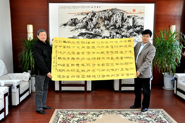 在认真赏析了苏学亭捐赠作品后,王少鹏高度评价了苏学亭书法作品的艺术水平,充分肯定了苏学亭一家对学校与校区发展做出的贡献,并对苏学亭的捐赠行为表示感谢。他希望苏学亭要做到人退心不退,继续为学校及校区的建设与发展发挥余热。(文:孙善清 图:任卫兵)
