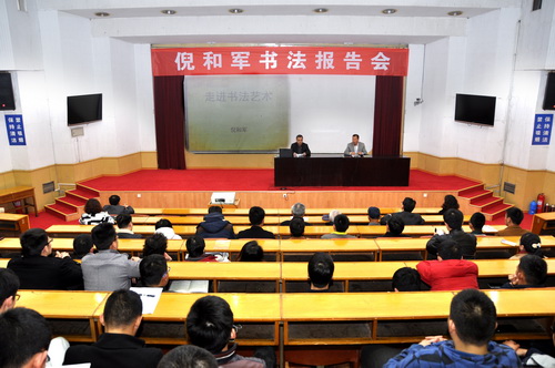 为推进校园文化建设,浓厚校园艺术氛围,3月17日下午,校区图书馆与校区团委联合邀请中国书法界“兰亭奖”一等奖获得者,泰山书法院副院长,青年书法家、篆刻家倪和军来校区为师生作了一场题为“走近书法艺术”的精彩报告。校区团委书记王靖磊主持了报告会。会前,副校长兼泰安校区党委书记、管委会主任,泰山科技学院党委书记、院长王少鹏,校区管委会副主任、学院副院长王以功会见了倪和军先生。