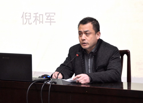 报告会上,倪和军现场进行了书法创作展示。(文:张建国 图:任卫兵)
