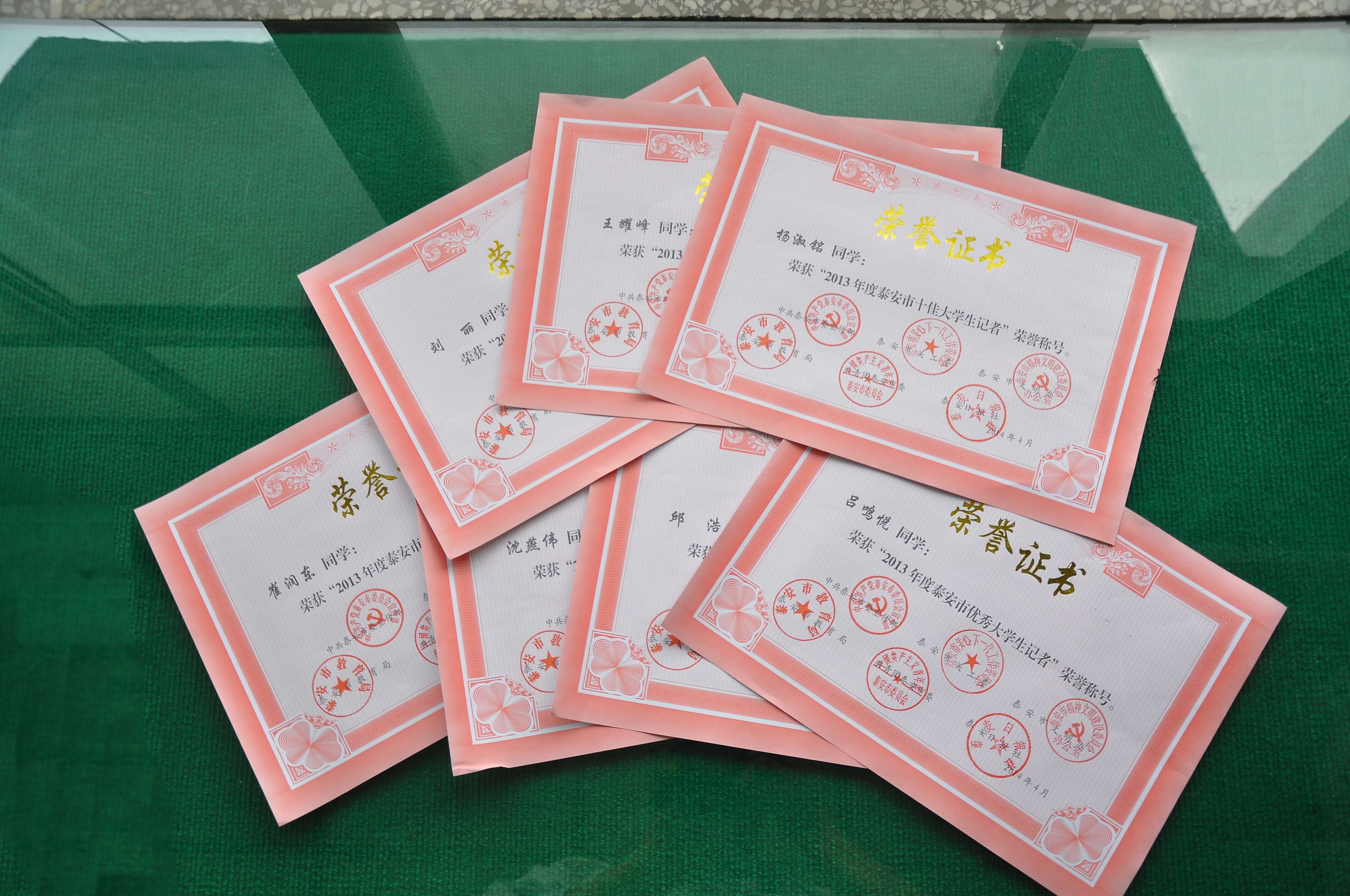 近日,由中共泰安市委宣传部、泰安市关工委、泰安市文明办、泰安市教育局、共青团泰安市委、泰安日报社联合举办的“泰安市十佳大学生记者”评选活动落下帷幕,校区新闻中心杨淑铭、刘丽、王耀峰三位同学荣获“泰安市十佳大学生记者”称号。另有崔润东、邱浩、吕鸣悦、沈燕伟四位同学荣获“泰安市优秀学生记者”称号。