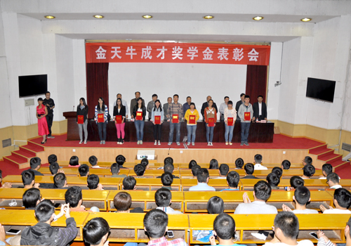 4月29日,“金天牛成才奖学金”表彰会在东校园报告厅举行,校区(学院)管委会常务副主任(常务副院长)蒋金泉,山东金天牛矿山机械有限公司董事长牛之平、总经理王强及校区有关部门负责人出席了本次会议。