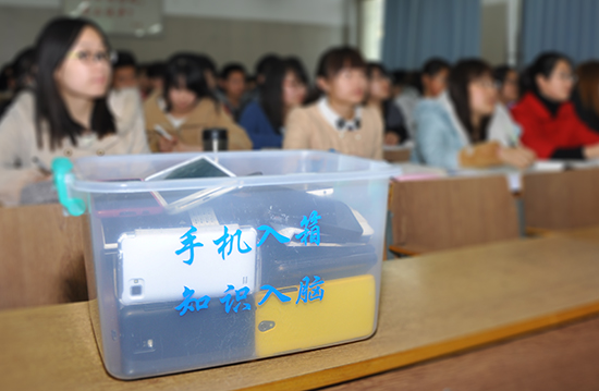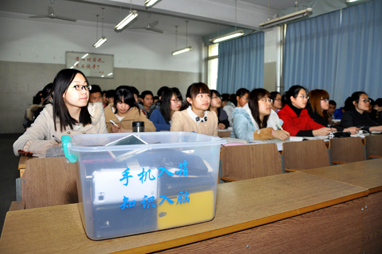 据介绍,这项被形象地概括为“手机入箱、知识入脑”的活动,就是为了彻底推进学风建设,解决上课期间学生因使用智能手机而影响学习的现象而推出的。在资土系教室外,记者看到,随着铃声响起,走进教室的学生纷纷把自己的手机关机后放进教室前排的一个箱子中。下课后,再各自取回自己的手机。