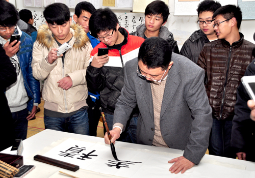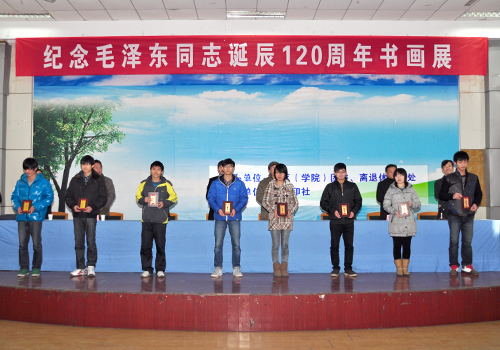 12月21日,校区(学院)团委、离退休工作处和泰山印社联合举办的书画作品展在大学生素质拓展中心举行。校纪委副书记兼校区(学院)党委常务副书记刘传玺,泰安市书法家协会名誉主席、泰山印社名誉社长孙健,泰安市美术家协会副秘书长、泰山印社理事赵银玲等出席活动。活动由校区(学院)团委书记戴东宝主持。