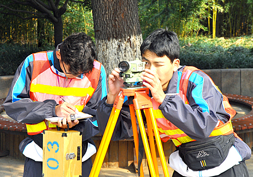 大赛分为导线及三角高程测量和四等水准测量两个部分,以“时间”和“精度”为考察指标,以外业测量、内业数据处理及测量基本规范等综合素质为评分标准,并严格划定各项指标所占比例。比赛路线在设置上不仅要求参赛小组有规范的测量技能、良好的测绘习惯,更考查测量小组如何协调分工保证测绘工作中常见的人身和仪器安全问题。比赛中,各参赛队在裁判的监督下,队员们专心致志,默契配合,团结协作,互相鼓励,显示出扎实的基础知识和实践动手能力。