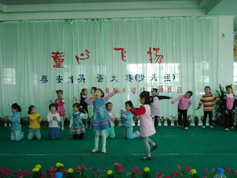 在泰安市教育局、泰安市团委、泰安市外事办翻译家协会的协助和支持下,4月27日,“童心飞扬”泰安市幼儿组英语大赛在我校幼儿园赛区举行了决赛。