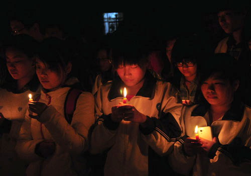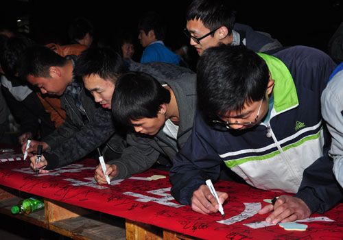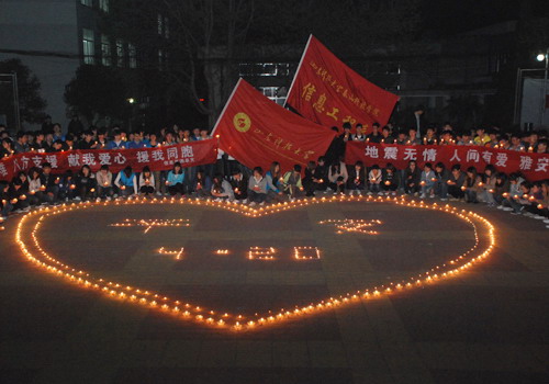 活动现场,记者看到了一张张写满鼓励雅安人民坚强的卡片、一排排蜡烛排列成的“4.20”字样和心形图案和“一方有难,八方支援,献我爱心,援我同胞”的横幅、一个个庄重的签名。晚8时02分,广大师生怀着沉重的心情为雅安同胞集体低头默哀,哀悼那些因地震而离去的雅安人民,祝福雅安人民早日走出灾难的阴影。(文:卜泠玉 袁庆远 图:田继爽)