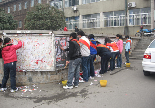 志愿者们分成三组,一组清扫南门外的垃圾及墙面的灰尘,一组擦洗校园内的野广告,第三组则在西门附近清扫路面垃圾、擦拭广告牌。活动中,大家不怕苦不怕累,积极参与,用热情感染同学们,他们的行为得到路人的称赞。