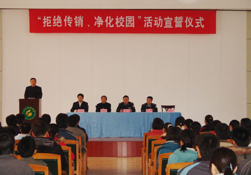 11月30日,校区在大学生活动中心组织开展“拒绝传销、净化校园”宣誓大会,校区保卫处处长雷宪法、学团工作部主任张恩生、以及泰安市公安局、工商局等负责领导出席大会。大会由校区团委副书记朱景星主持。
