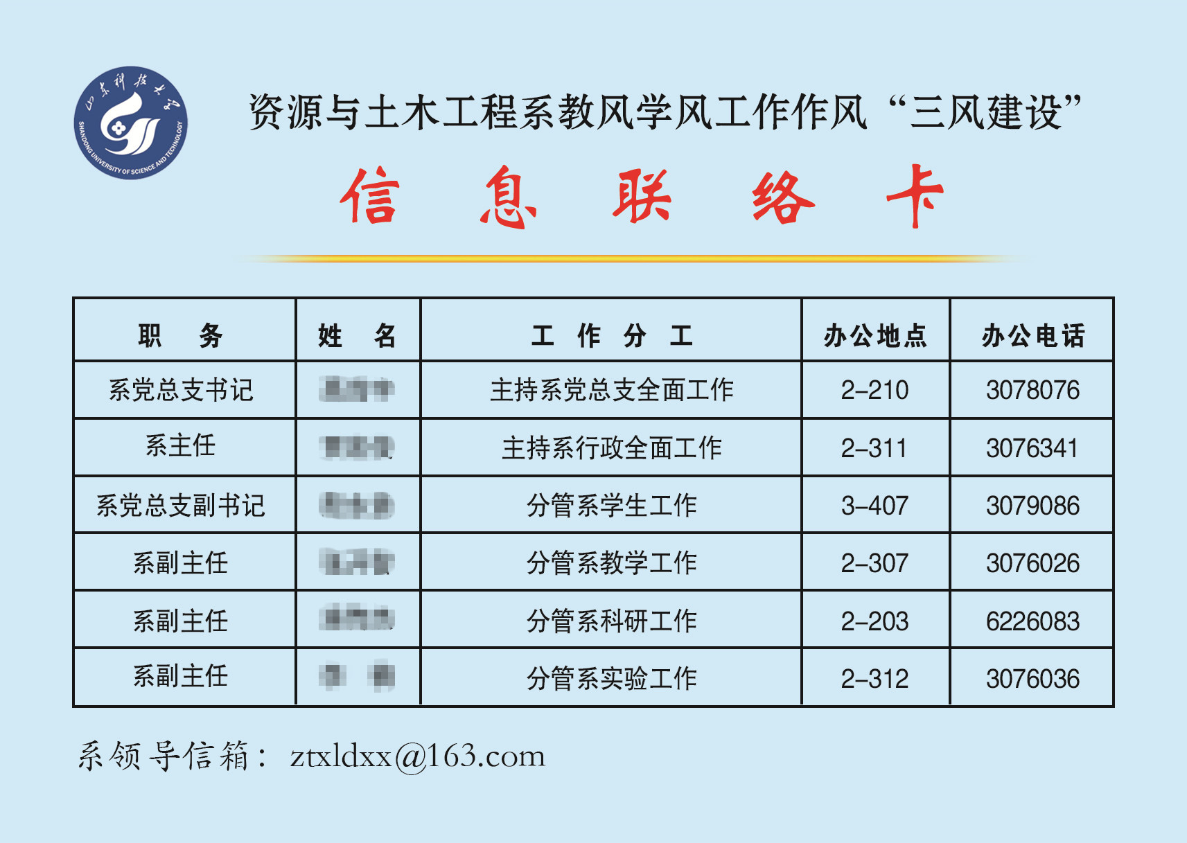 在资土系,记者看到了这张联系卡。卡上面印制着系领导姓名、联系方式、电子邮箱、工作分工等相关信息。开学初,资土系的学管人员将这张卡发送到了全系485个宿舍。