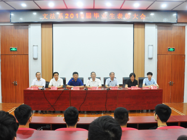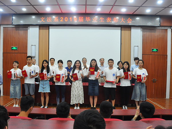 会议开始前,文法系毕业生共同排练演唱《我爱你,中国》和《送别》两首歌曲,表达对母校的感恩之情。会议伊始,马福泉宣读《文法系关于表彰2019届毕业生先进个人的决定》。文法系2019届毕业生在研究生考试、公务员考试、法律职业资格等考试中均取得了优异成绩。其中,刘渊园等52人考取了硕士研究生;孙维昌等8人成功考取了省内外的公务员或事业编;谢飞等32人通过了国家司法考试;张昕同学出国留学。根据《文法系优秀毕业生评选办法》,经研究决定授予刘渊园等77名同学“文法系2019届优秀毕业生”荣誉称号。与会领导老师为优秀毕业生颁发荣誉证书和纪念品。