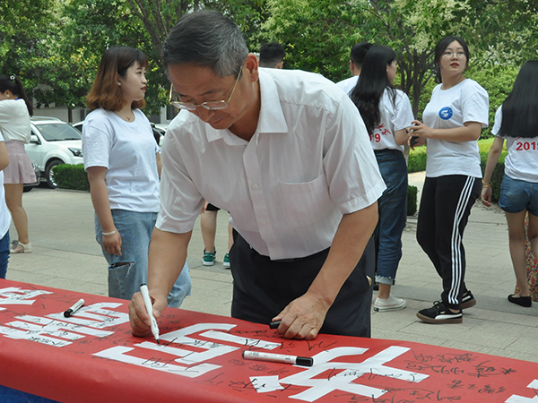 6月14日下午,文法系2019届毕业生于一号教学楼前广场举行毕业合影和毕业条幅签字活动。