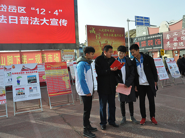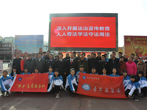 12月4日上午,泰安市岱岳区政府、岱岳区司法局在光彩大市场举办“12·4”国家宪法日普法宣传活动。法学教研室主任刘辉、“律舟”志愿服务队和青年法学会共20余名成员共同参与。