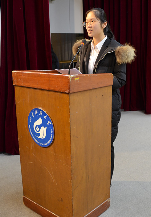 阚新妤结合自身经历,从项目价值、创新思维、学习一技之长三方面向大家介绍“如何参加科研活动”,并提出“要努力实践”、“多询问老师”、“团队成员要通力合作”、“注重人际交流能力”四点建议。她希望大家要有对科研的热情,同时要有足够的耐性,多参加科技创新类比赛来提升自己。陆新时从课程学习、科技创新、学生工作、志愿服务、文体活动五方面为大家的大学生活提出建议。他结合英语四六级备考经历建议大家要学会坚持;结合参赛经历建议大家要主动询问优秀学长,做到“不等不靠”,同时要善于利用课余时间自学;建议大家尽早找到方向,培养自己的核心竞争力;结合自身工作经历建议大家要正视学生干部的工作,不忘“服务同学,锻炼自我”的初心。程娅萍从赛前准备、组建团队、答辩演讲三方面介绍自己第一次参加科技创新比赛的经历。她告诉大家科技创新并不困难,鼓励大家勇敢尝试,在参赛过程中不断提升自己。(文:张宝振 曹浩浩 图:崔译丹 编辑:王腾)