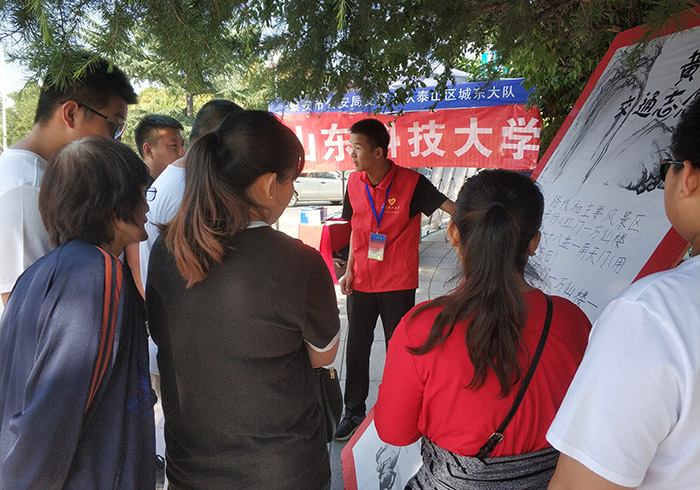 为了充分挖掘泰山等校区驻地的资源优势,先后依托泰山景区、泰山火车站等城市资源,确立了校外志愿服务活动以“青·黄·红·绿”作为色彩引领,以“文化·文明·爱心·环保”作为核心内容,开展了一系列独具特“色”的志愿服务活动。其中,泰山景区开展的“青未了”泰山文化宣讲志愿服务,增进了爱国和敬业意识;红门路口开展的“黄网格”文明出行交通志愿服务,增进了法治和文明意识;中心医院开展的“红细胞”就医爱心导诊志愿服务,增进了诚信和友善意识;泰山车站开展的“绿动力”低碳环保出行志愿服务,增进了和谐和富强意识。