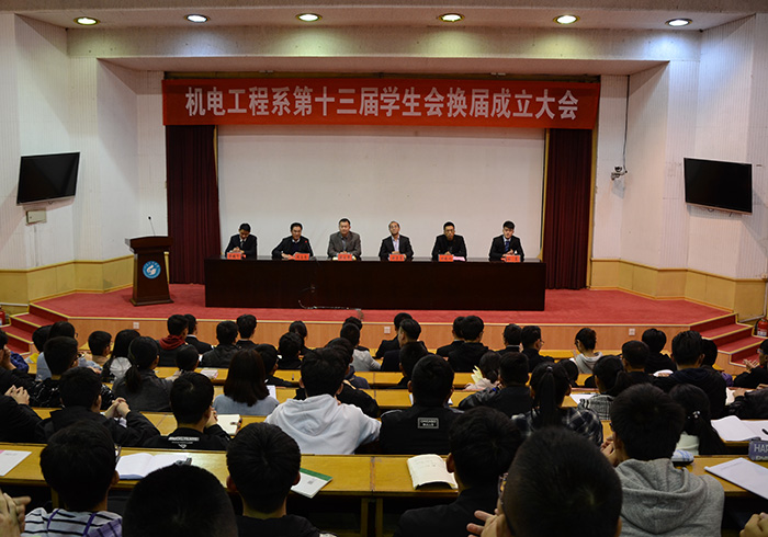 10月31日下午,机电系在四号楼报告厅召开第十三届学生会换届成立大会。系党总支副书记殷永贵、团总支书记谢清勇、辅导员刘钦兴、系学生会第十二、十三届全体成员参加了大会,大会由系团总支周立志主持。