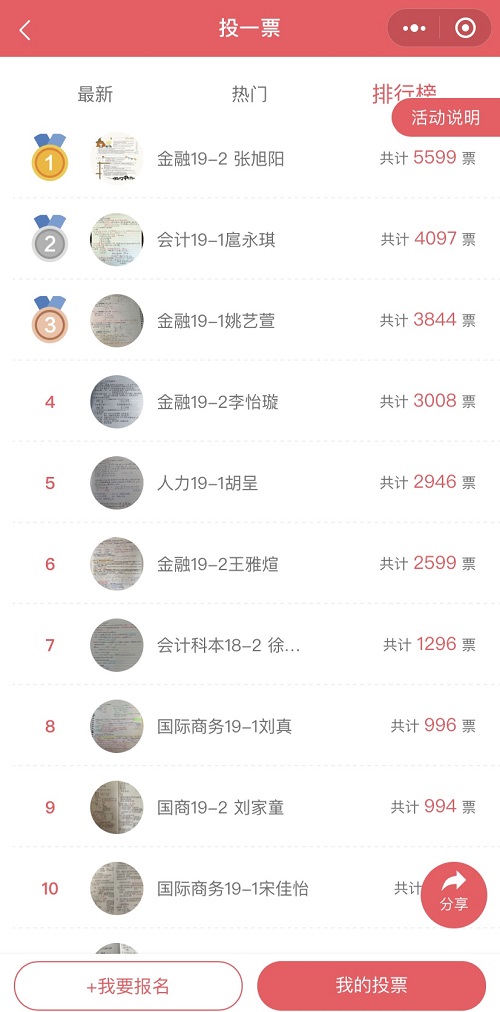 本次活动共收到有效票数三万五千张,访问量达近四万次,在学生层面引发强烈反响。经过激烈角逐,金融19-2张旭阳和会计19-1扈永琪分别以5599票、4097票荣获一等奖,金融19-1姚艺萱等4人获二等奖,会计(科本)18-2徐焕莉等6人获三等奖。(文:李聪 图:王大伟 )