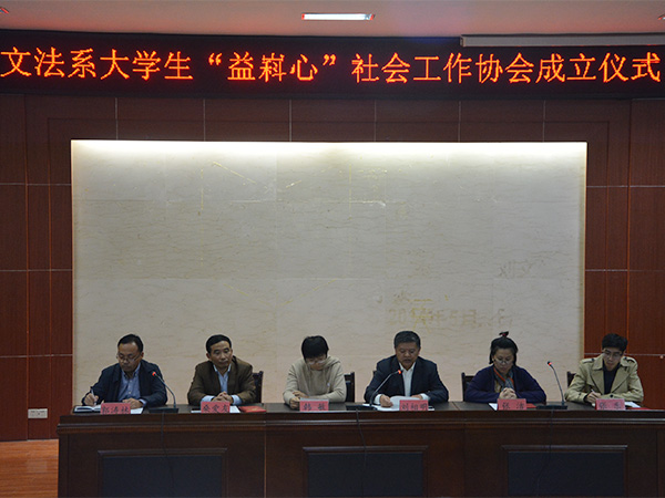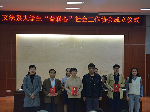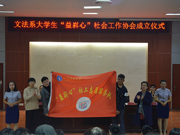 10月25日下午,文法系大学生“益嵙心”社会工作协会成立暨“益嵙心”社工志愿服务队授旗仪式在模拟法庭成功举行。文法系党总支副书记刘相明,泰安市泰山小荷公益事业发展中心办公室主任韩敏,校区、学院团委社团部部长张洁,社会工作教研室主任桑爱友,文法系团总支老师,系学生会和各社团代表和“益嵙心”社会工作协会全体成员等参加成立仪式,会议由文法系团总支书记郭涛林主持。
