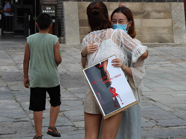 8月10日,调研团队为丰富调研内容,了解更多大众看法,决定进行最后一项内容——“给艾滋病人一个拥抱”,并将地点设为岱庙。在到达岱庙之前,我们便已分好任务,由组内两人假扮艾滋病人,带着拥抱“爱”,远离“艾”的宣传标语,站在人流量多的入口处、出口处、售票处等地,通过测试广大群众对艾滋病人的态度,来了解他们对艾滋病相关知识的了解。队伍内两名男生躲在暗处保护两名女生的安全,其余队员则对本次活动进行拍照及录像,以及对拥抱“艾滋病人”的游客进行采访。不过此次实践效果效果并不是很理想,不少群众仍持观望状态,但还是有人理智的给了我们队员一个爱意满满的拥抱。