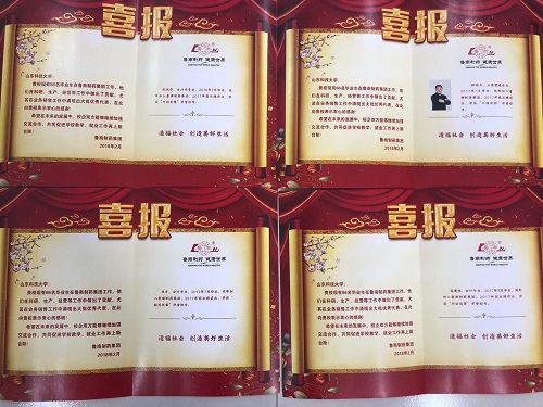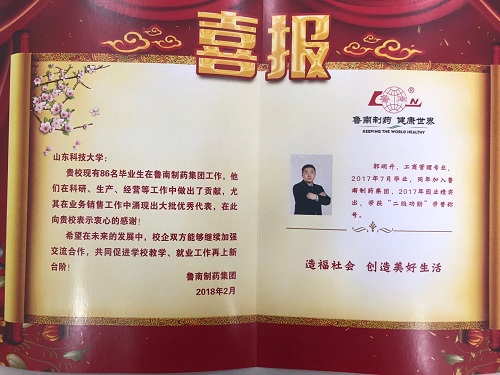 喜报中提到:近年来山东科技大学为鲁南制药集团输送了大量优秀毕业生,他们在科研、生产、经营等工作中做出贡献。经管系2017届工商管理专业毕业生郭明升,2017届会计专业毕业生张东、高建林,2016届会计学专业邵明存凭借突出业绩分别荣获集团“二级功勋”,“银质奖章”、“行动奖章”表彰。