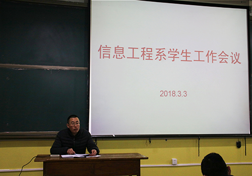 3月3 日,信息系于1c102召开学生工作会议, 全体辅导员,学生组织副部长及以上主要学生干部、各班班长、团支书及学生党员参加,会议由信息系团总支书记蒲蓬勃主持。