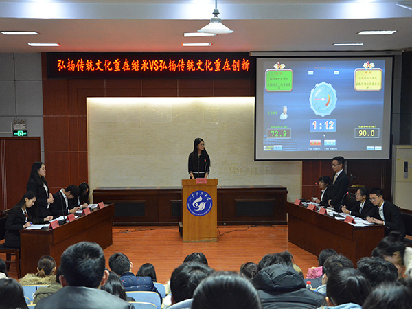 经过层层筛选角逐,文法系“决战岱岳之巅队”和资土系“我们说什么都队”成功晋级决赛。参赛双方紧紧围绕“中国传统文化传承和创新哪个更重要”展开辩论,正方观点为“中国传统文化继承更为重要”,反方观点为“中国传统文化创新更为重要”。本次辩论赛沿袭传统,共分为立论、攻辩、自由论辩、总结陈词、评判颁奖五个环节。在立论环节中,正反双方各自亮明观点,思路清晰,论据充分;随后,双方进入攻辩环节,他们分别就对方观点提出质疑,辩手们旁征博引、针锋相对,或话语犀利、或幽默机智,赢得在场观众的阵阵掌声;自由论辩环节更是上演了一场唇枪舌战,双方妙语连珠,展现了辩手们良好的知识储备和强大的心理素质,现场精彩纷呈,高潮迭起,引人入胜;接着,双方进行总结陈词,再次阐明观点。经过紧张的比拼,文法系“决战岱岳之巅队”凭借队员之间默契的配合斩获冠军,文法系高晚莹和资土系顾雅楠获得最佳辩手奖,经管系李晓晗等5人获得优秀辩手奖。(文:李怀恩 葛庆盼 图:褚蕴恒 编辑:李晓禾)